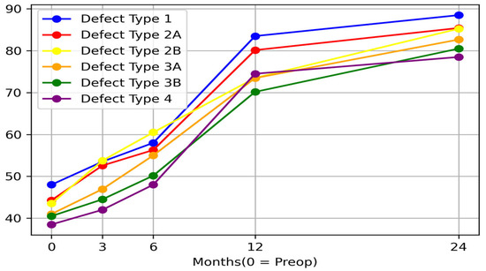 Time evolution for Harris Hip Score for all defects. Values are expressed as arithmetic mean; 0 is considered preoperative period.