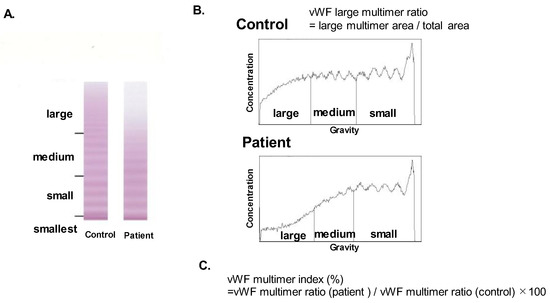 vWF large-multimer analysis was performed using blood samples obtained at hemodynamically stable condition following the initiation of MCS supports, according to the method proposed by Ruggeri and Zimmerman (SRL Co., Tokyo, Japan) [7]. vWF large multimers were quantified from images of vWF multimer analysis by gel electrophoresis (Figure 1A). Using ImageJ, the central one-third of the lane was scanned. vWF multimers were divided into three parts (large, medium, and small/smallest multimers). A large-multimer ratio was calculated as the ratio of the large-multimer area to the total-multimers area (Figure 1B). A vWF large-multimer index was defined as a large-multimer ratio normalized by the control one (Figure 1C) [8,9]. In summary, a lower vWF multimer index indicates more progressed AVWS.