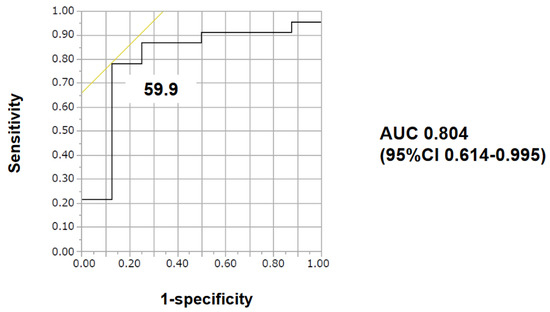 Impact of baseline characteristics including vWF large-multimer index on the primary endpoint was investigated (Table 2). A cutoff of vWF large-multimer index to predict the primary endpoint was calculated as 59.9% with an area under curve 0.804 (78.3% of sensitivity and 87.5% of specificity; Figure 3).
