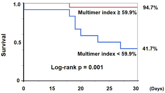 The 30-day survival was significantly lower in the low-vWF, large-multimer index (<59.9%) group compared with others (41.7% versus 94.7%, p = 0.001, Figure 4).
