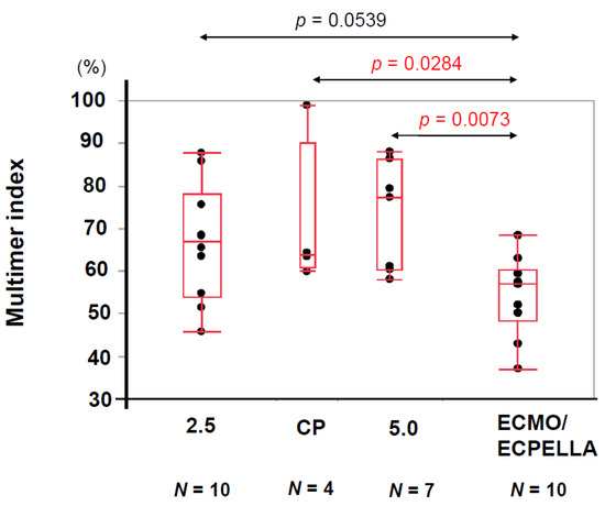 Detailed mechanism remains unclear, but ECMO support seems to cause higher shear stress together with a blood–air interface, resulting in more advanced AVWS [10]. A relatively rough configuration of the ECMO cavity surface also seems to cause more advanced AVWS [11]. The median level of lactate dehydrogenase was consistently higher in the lower multimer index group.