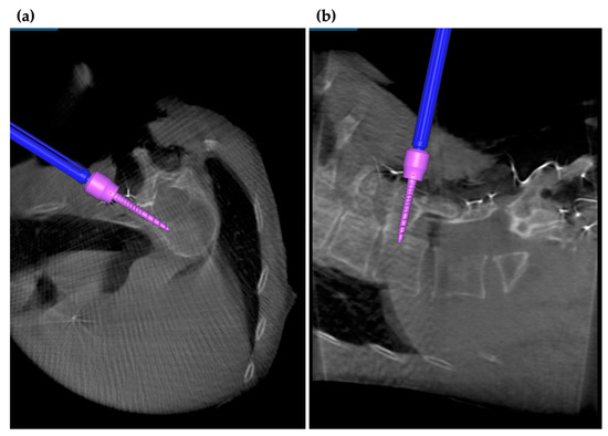 The S2 alar iliac (S2AI) screw placement also has advantages when using the navigation system (Figure 5a,b). S2AI screw fixation is used as a strong distal anchor in various spinal diseases such as spinal deformities, spinal tumors, and infections [43,44]. On the other hand, it is not easy to insert a S2AI screw of sufficient length in a precise direction. When inserting a S2AI screw under fluoroscopy, precise control is required for obtaining fluoroscopic views such as the frontal view and teardrop view. Moreover, frequent use of fluoroscopy increases radiation exposure and can potentially cause contamination problems. The deviation rate for freehand S2AI screw insertion has been reported to be 6.2% [41]. Using the navigation system, it is possible to place a screw of sufficient length while confirming the correct insertion direction. The navigation system is also useful when the anatomical positioning is unclear under fluoroscopy. Nottmeier et al. [45] reported that 20 patients who underwent navigated S2AI insertion had no screw deviation and complications. In other reports, the accuracy rate of the S2AI screw insertion under CT-based navigation generally exceeded 95% [46,47].