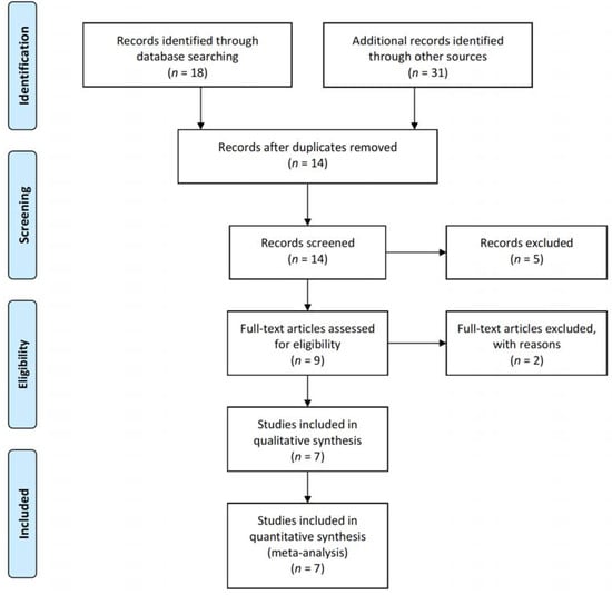 A total of 18 papers were searched for using the international electronic databases, and 31 papers were added through additional searches, resulting in a total of 49 papers. For the processing of duplicate data, 14 papers were excluded through EndNote 20. Five papers were excluded by reviewing the titles and abstracts, according to the inclusion criteria determined by two researchers. Finally, two papers were identified through the title and abstract, but the results were not provided as numerical values, so they were excluded and seven papers were selected [,,,,,,]. The seven selected papers were analyzed through a systematic review and meta-analysis (Figure 1).