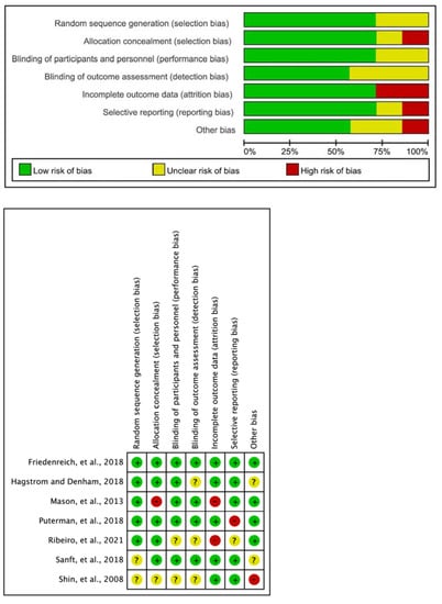 The quality assessment of the studies selected in this review was evaluated using the seven-item Cochrane RoB tool developed by the Cochrane Bias Method Group. RoB was rated as low (+), uncertain (?), or high (−) by two researchers with meta-analysis research experience. In the same way, for study selection and data extraction, if there were items that did not match, the original text was reviewed and re-evaluated.