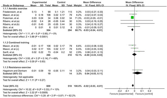 Telomere length was evaluated in 939 patients from 7 RCTs. Compared to the control group (usual care or inactivity), significant improvement was observed in the experimental groups that performed exercise. The results analyzed through the fixed-effects model are −0.02; 95% confidence interval (CI), −0.03 to −0.01; heterogeneity (χ2 = 10.32, df = 9, I2 = 13%); overall effect (Z = 3.32, p < 0.001). In the subgroup analysis classified by exercise type, combinded training and resistance exercise did not show significant improvement compared to the control group, and only aerobic exercise showed significant improvement (−0.03; 95% CI, −0.04 to −0.01; heterogeneity (χ2 = 1.11, df = 5, I2 = 0%); overall effect (Z = 3.88, p < 0.001)) (Figure 3).