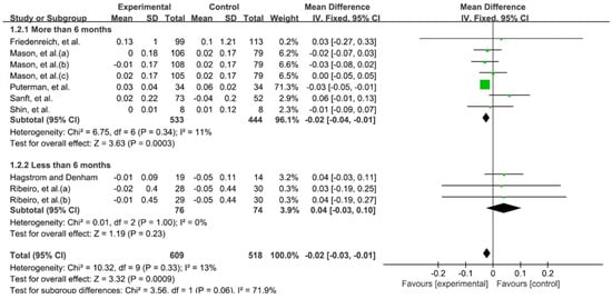 The quantitative comparison according to the duration of exercise was classified into 6 months or more, and less than 6 months. When the type of exercise was not distinguished, exercise for more than 6 months had a significant effect on telomere length (−0.02; 95% CI, −0.04 to −0.01; heterogeneity (χ2 = 6.75, df = 6, I2 = 11%); overall effect (Z = 3.63, p < 0.001)) (Figure 4).