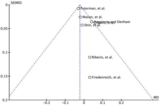 In previous systematic review studies, it was reported that exercise had a potential effect on telomeres and that moderate-intensity exercise would be beneficial []. In addition to these results, other systematic reviews confirmed that telomere length was longer in active people than in inactive people, regardless of exercise intensity []. Taken together, it may be said that aerobic exercise with moderate intensity in active conditions is more effective than in inactive conditions. In addition, in a study that predicted mortality through telomere length in duration of exercise, an increase over five years reduced the mortality rate []. To make this clearer, it has been suggested that comprehensive lifestyle changes, including exercise for five years, increase telomere length []. Based on these results, it was judged that there would be differences according to the period. In this review, subgroup analysis was classified based on six months of data, in order to quantitatively perform subgroup analysis in seven RCTs. The results were different, and when the type of exercise was not distinguished, and the exercise was performed continuously for more than six months, there was a significant effect on telomere length compared to the control group.