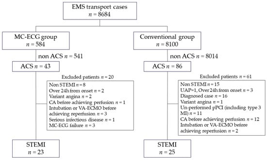 - Yufu, K.; Shimomura, T.; Fujinami, M.; Nakashima, T.; Saito, S.; Ayabe, R.; Kawano, K.; Ishii, Y.; Okada, N.; Akioka, H.; et al. Impact of Mobile Cloud Electro-cardiography System on Door-to-Balloon Time in Patients with Acute Coronary Syndrome in Oita Prefecture. Circ. Rep. 2019, 1, 241–247. [Google Scholar] [CrossRef] [PubMed]