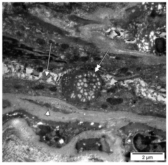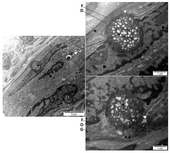 Biggiogera et al. (1997) observed that during the apoptosis of thymocytes, nuclear ribonucleoprotein (RNP) components form clusters that are extruded into the cytoplasm []. The research group observed that these heterogeneous ectopic RNP-derived structures (HERDs) consist of perichromatin fibrils, interchromatin granules, perichromatin granules, and nucleolar material [,]. Ultrastructural evidence was further brought [] (Figure 6C). It is thus reasonable to speculate that the presence of the extruded nucleoli in DP vasculogenic cords could relate to the lumen-acquiring phase of vasculogenic cords in which cell remodelling occurs.