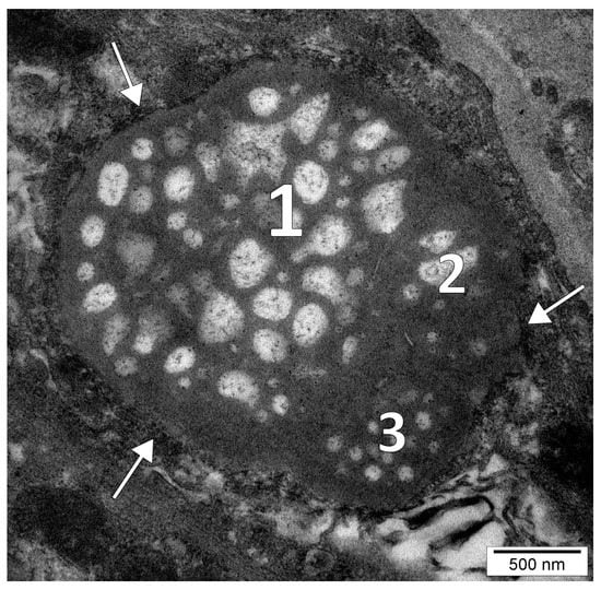High magnification electron micrograph of the dental pulp of a human upper lateral incisor. A multilocular nucleolus is depicted consisting of three (1–3) aggregated bodies and coated by a layer of pre-ribosomes (white arrows).