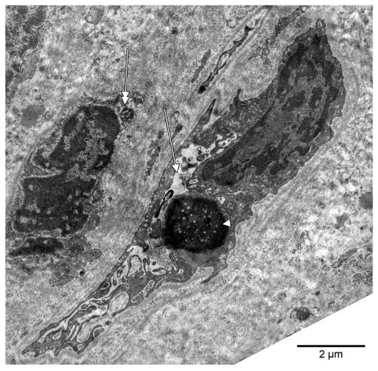 We identified peculiar ultrastructural aspects of some nucleoli. Mature nucleoli with homogenous morphologies were identified in spindle-shaped cells (Figure 1). They were most likely linked to the nucleolar organizer regions (NORs) of those nuclei, either central or polar. Interestingly, those nucleoli were of comparable sizes and were partly embedded in the nucleus and partly extruded in the cytoplasm. They consisted of fibrillar centres, dense fibrillar components, and the granular component; on the adnuclear side, they were coated by heterochromatin, while on the abnuclear (cytoplasmic) side they were coated by a thin rim of (pre)ribosomes, in direct contact with the intermediate filaments from the cytoplasm. The presence of the (pre)ribosomes helped us to consider these nucleoli as being mature, functional, and not the primitive type, which should have been larger and lacking a ribosomal coat.