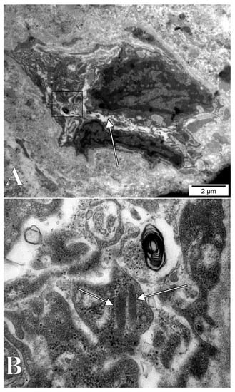 However, there was no obvious evidence of nucleolus-linked NCSs, such as in the study of Terzakis (Figure 6A) and the nucleoli we found did not display the regular size and uniform repartition found in NCSs. Moreover, the lumen of the individual tubules in NCSs was found to directly communicate with the perinuclear space [], which was not the case in our study. On the other hand, the ribosome coating we identified could represent a peculiar form of rough endoplasmic reticulum, i.e., a slightly modified NCS.