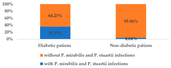 Of the 339 patients, 93 (27.43%) had diabetes and, out of these, the majority (80.65%) had P. mirabilis infections, and only 19.35% had P. stuartii infections. Patients infected with Proteeae species represented 35.77% (over one third) of all diabetic patients admitted to the ICU and surgical wards, while only 4.04% of all non-diabetic patients became infected with the two species mentioned above (Figure 1).