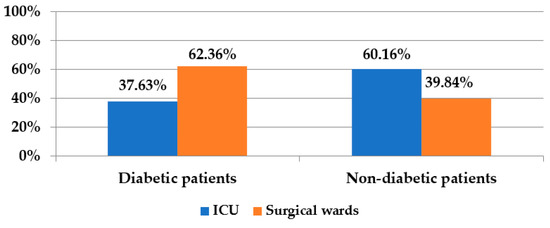 From the beginning, it was observed that diabetes, as a comorbidity, was an important risk factor for infections with the two species of Proteeae (OR = 13.24 [9.87–17.76], p < 0.001). The diabetic patients came mainly from surgical wards, while those without this pathology were mostly admitted to the ICU (p < 0.001), thus involving a greater degree of complexity and invasiveness of the diagnostic and therapeutic procedures.