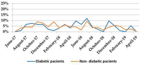 The highest number of infections in both diabetic and non-diabetic patients was recorded in July 2018, which shows that there are predisposing factors for Proteeae infections in both DM and in non-DM groups, related to environmental conditions such as temperature (July being a warm month). (Figure 3). The Spearman correlation coefficient between the monthly distribution of infections among diabetic and non-diabetic patients was 0.519, being statistically significant (p = 0.011).