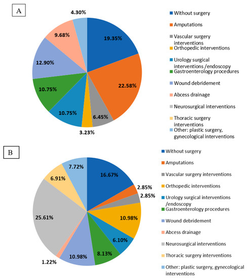 Distribution of surgical interventions/procedures performed in diabetic (A) and non-diabetic (B) patients.