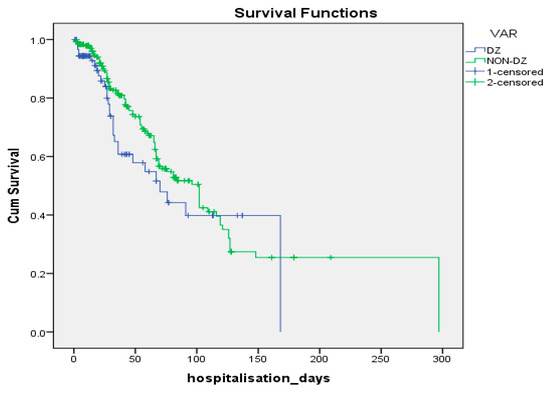 The importance of diabetes as a comorbidity is reflected in the survival analysis, although G1 subjects had fewer risk factors for infection and the strains were less resistant and the length of hospitalization/catheterization was shorter, survival did not differ when compared with G2 patients (log-rank test p = 0.163). Multivariate Cox regression analysis revealed the following factors associated with risk of in-hospital death: