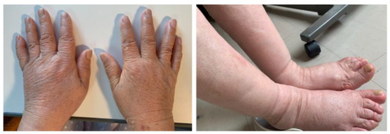 She had experienced severe joints pain in bilateral wrists and fingers 7 weeks before hospitalization. The joint pain spread to her ankle joints within a few days. These symptoms worsened to maximum intensity within a week, and she could barely walk. Five weeks before her hospitalization, her daughter noticed that she had pitting edema of her limb. Three weeks before hospitalization, she visited her family clinic and received diuretics and painkillers. However, neither her pain nor edema improved, and she was admitted to our hospital.