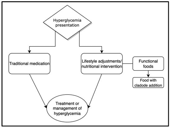 The general approaches of the management and treatment of hyperglycemia, which include the use of traditional medication with/or lifestyle adjustments and nutritional intervention (the use of functional foods) [,,].