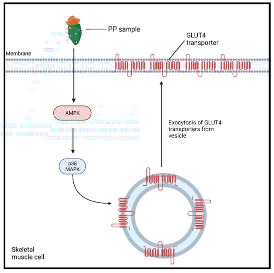 The proposed PP-enhanced AMPK pathway for an antidiabetic effect. PP sample (Opuntia ficus-indica var. saboten (OFS) extract full) enhances the activity of AMP-activated protein kinase (AMPK), which triggers the activation of p38 mitogen-activated kinase (MAPK) []. The latter enzyme induces the exocytosis and translocation of GLUT4 to the plasma membrane, enhancing the influx of glucose into the cell.