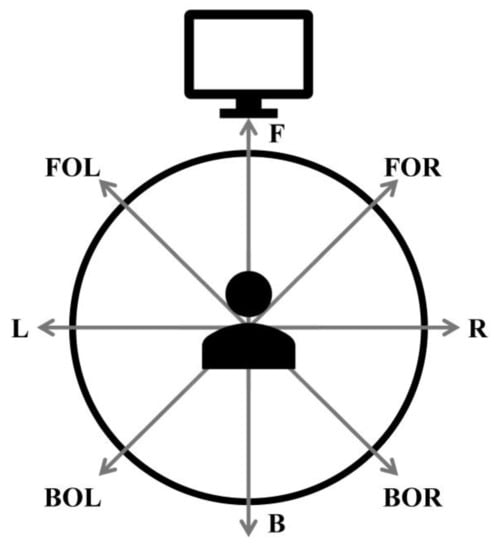 Schematic of the tilting directions of the device. B: back, BOL: back oblique left, BOR: back oblique right, F: front, FOL: front oblique left, FOR: front oblique right, L: left, and R: right.