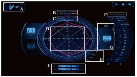 Display interface of a Spine Balance 3D. (A) angle setting, (B) classification color, (C) measured value, (D) radial data, (E) force plate symmetry, (F) evaluation records, (G) output result, and (H) patient’s information.