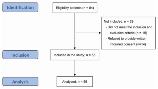 In December 2020, among 84 potential participants, as shown in Figure 4, 15 participants who did not satisfy the study inclusion criteria were excluded by the physical therapist. Fourteen participants were excluded because they did not agree to participate in the study. Eventually, 55 patients participated in the study. Table 1 shows the general characteristics of the enrolled participants. Among all the variables, statistically significant differences were found only for height, weight, and capsular release (p < 0.05).