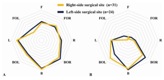 No significant differences were found between the left and right sides in the eight directions (p > 0.05). The mean value difference was the largest in the BOL of the CMSR (Figure 5). In addition, no significant differences were found in any of the FPS variables (p > 0.05) (Table 2).