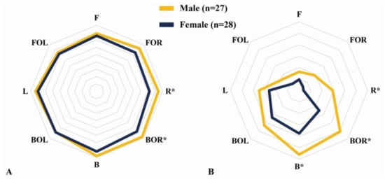 The DCMRs in R and BOR were significantly higher in males than in females (p < 0.05) (Figure 6A). Similarly, the CMSRs in R, BOR, and B were significantly higher in males than in females (p < 0.05) (Figure 6B). However, we found no significant differences in the FPS (p > 0.05).