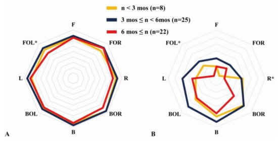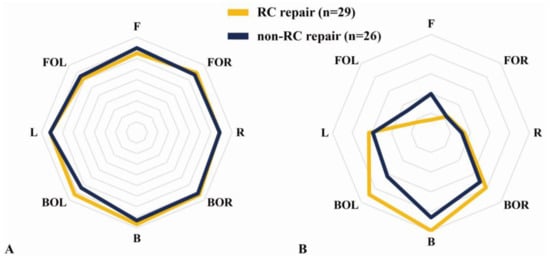 However, significant differences in sex and POD were found in the results of this study (p < 0.05). CMA according to sex showed better core muscle symmetry in males than in females. This result is similar to that of a study that analyzed surface electromyography (sEMG) results from the back extensor muscles according to age and sex, and muscle fatigue was observed to be more in females []. Core muscle symmetry was best revealed in the period from >3 months to <6 months, which corresponds to the intensive rehabilitation period after arthroscopic shoulder surgery [,]. These results can explain the changes in CMA based on training age []. In other words, CMA is associated with overuse [], and it is thought that an intensive rehabilitation period focusing on strength training of the back was effective from 3 months after surgery. In Figure 8, DCMR showed a significant difference in FOL, and, moreover, there was a significant difference seen in FOL and R in the CMSR. These results are consistent with the fact that there was a significant difference overall in the front, based on the fact that the back muscles are activated when tilting to the front [].