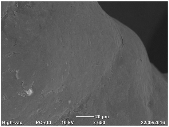 The microphoto shows the surface topography of the native surface that gained roughness through the sand-blasting process. SEM analysis, total magnification 600×.