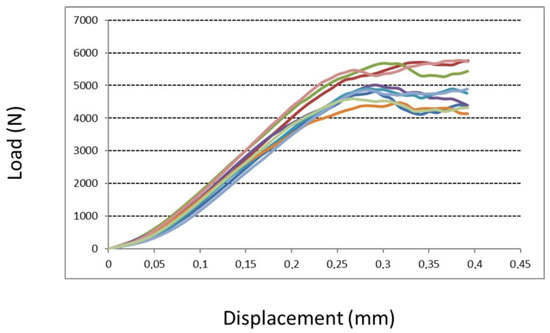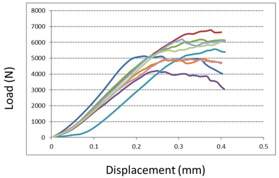 Compression test results for cubic specimens with native surfaces. The figure shows the increasing trend of the compression load (N) that the specimens faced before their failure: after a linear (elastic) trend, the load reaches its maximum value (peak) before the failure of the specimen. The displacement represents the deformation value of the specimen before it is crushed. All specimens failed within 0.4 mm of displacement. Each colored line represents the increasing trend of compression load of a specimen.