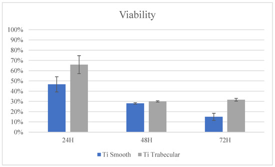 Cellular viability at 24, 48, and 72 h using the AlamarBlue® test showed an increased vitality over time in all experimental groups. Both Ti smooth and Ti trabecular samples showed improved cellular viability after 24 h in culture compared to CNTR-. After 48 and 72 h in culture, the viability of cells seeded on both surfaces was higher than that of cells seeded on the CNTR- group, but it was lower than the values found at 24 h. Details are reported in Figure 7.