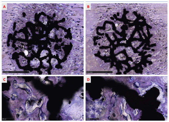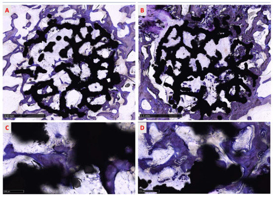 The panel shows the overviews of two representative sections of (A) a trabecular structure with treated surfaces and (B) a trabecular structure native surfaces per spongious bone. New bony trabeculae surround the titanium trabeculae, running into and among the macropores of the implant toward the implant surface (C,D). As reported for cortical bone, in both groups, the process of bone deposition is ongoing and new trabeculae are in a phase of maturation around the implant (C,D). Furthermore, newly formed bone comes into contact with the implant surface, osseointegrating with it. Toluidine blue/pyronin yellow: (A,B) total magnification 13× and (C,D) total magnification 100×.