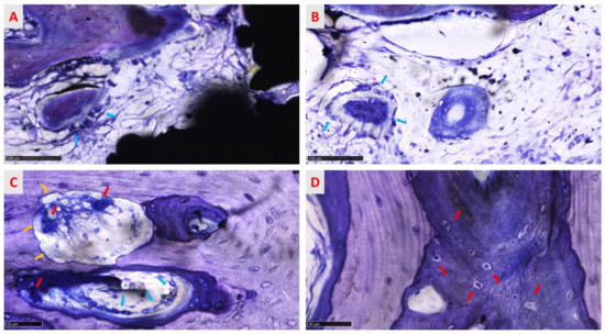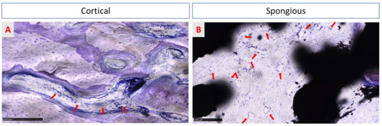 Both images show spaces occupied by the medulla. In treated surface samples, in cortical bone (A), neurovascular Haversian canals are characterized by blood vessels (red arrows), observable in longitudinal sections. In contrast, many vessels are detected in the medullary spaces of spongious bone (B) (red arrows). In both groups, no inflammatory infiltrate is observed. Toluidine blue/pyronin yellow: (A) total magnification 150× and (B) total magnification 100×.