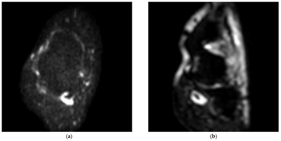 For 16 PT of FHL tendons and 15 PT of PT, DWI had 100% sensitivity for both tendon injuries, 88% specificity for FHL, and 100% for PT with high to perfect agreement and a significant statistical relationship to the reference (p < 0.05, k: 0.875–1.00). Except for the T of FHL tendons (100% sensitivity and 67% specificity), all other PT and T of tendons were diagnosed by DWI with perfect agreement and 100% sensitivity/specificity, without any statistical approval over the gold standard or diagnostic arthroscopy (p > 0.05, k: 1.00) [24,25] (Table 3a–c; Figure 3a–c).