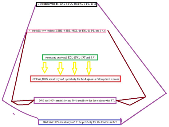 MRI depicted all tendon injuries with 70% sensitivity and 100% specificity, and had significant statistical correlation to the surgical arthroscopic references with high agreement (p < 0.05, k: 0.609). MRI sensitivity ranged from 50 to 89% for all tendon injuries (50% for EHL and FHL, 89% for FDL, 83% for A, 75% for EDL, 64% for PT, and 90% for TP) with almost 100% specificity for the R, T, and PT of all tendons. In this research, MRI showed highest specificity for the diagnosis of all injured tendons. Regarding the R of nine tendons (1 PT, EDL, and FHL, and 6 A), there was no statistical correlation for each of the tendons separately, and DWI had 100% sensitivity and specificity for the diagnosis of all ruptured tendons without any statistical differences against the surgical approaches with perfect agreement (p > 0.05, k: 1.00). DWI had 100% sensitivity and 90% specificity for the visualization of 41 tendons with PT, and 100% sensitivity and 83% specificity for the evaluation of 31 tendons with T, by certain agreement and with a significant statistical relationship over the gold standard, arthroscopy, and physical examination (p < 0.05, k: 0.890–0.899) [24,25].
