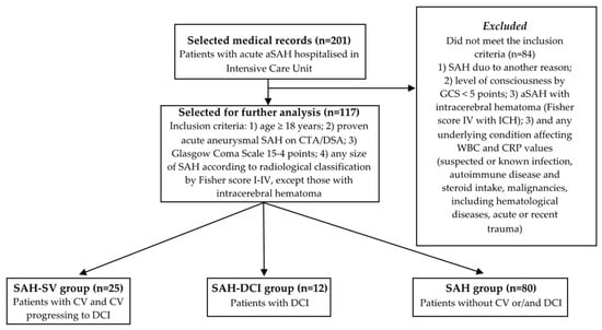 - Romero, F.R.; Cataneo, D.C.; Cataneo, A.J.M. C-reactive protein and vasospasm after aneurysmal subarachnoid hemorrhage. Acta Cir. Bras. 2014, 29, 340–345. [Google Scholar] [CrossRef] [PubMed] [Green Version]