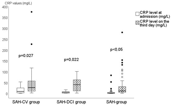 - Jeon, Y.T.; Lee, J.H.; Lee, H.; Lee, H.K.; Hwang, J.W.; Lim, Y.J.; Park, H.P. The postoperative C-reactive protein level can be useful prognostic Factor for poor outcome and symptomatic vasospasm in patients with aneurysmal subarachnoid hemorrhage. J. Neurosurg. Anesthesiol. 2012, 24, 317–324. [Google Scholar] [CrossRef] [PubMed] [Green Version]