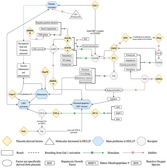 Activin A and VEGF act in a synergic manner. Both contribute to the LSEC survival by maintaining the extracellular matrix []. Activin A stimulates collagen production in stellate cells and tubulogenesis in LSECs []. Prior studies remarked a decreased activin A and VEGF level in HELLP women but a higher inhibin A level [,]; it was also observed that inhibin A behaves like an activin A inhibitor []. These molecules lead to an increased apoptosis rate of LSECs and a diminished restoration [].