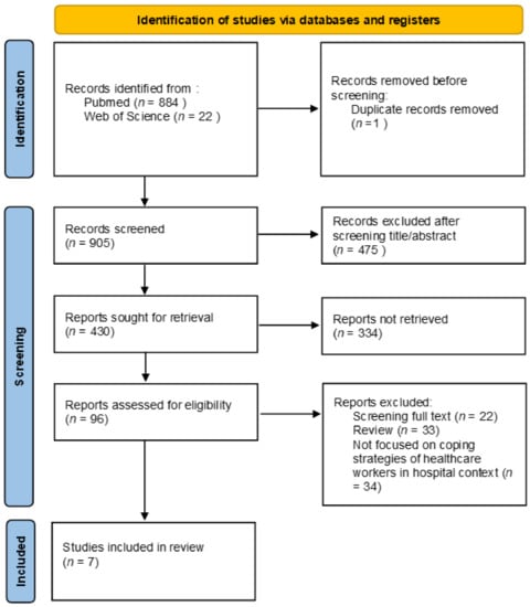 We conducted a narrative review to investigate the efficacy of coping strategies used by healthcare workers to reduce burnout symptoms. Literature studies were performed in accordance to the PRISMA (Preferred Reporting Items for Systematic Reviews and Meta-Analyses) guidelines by searching on PubMed and Web of Science and registered to PROSPERO (ID 312225). We considered the articles from 2008 to 2021. The search combined the following terms: “burnout healthcare professional hospital coping” (all field). There was a total of 844 articles identified via PubMed (Figure 1) and 22 articles from Web of Science. All articles were evaluated by title, abstract, full-text and specificity of the topic (Figure 1). The duplicates were removed, we considered articles that focused on coping strategies of healthcare workers in hospital context.