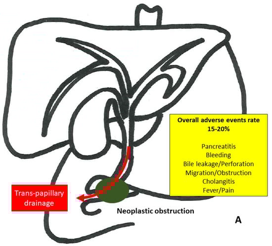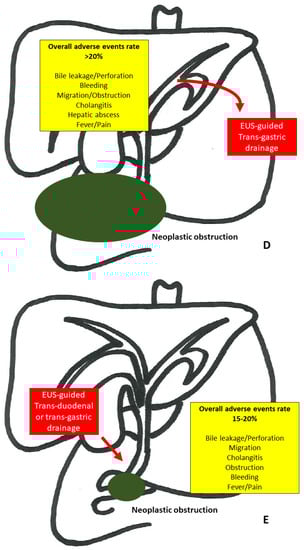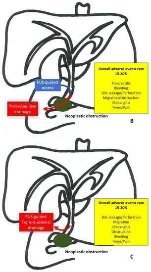 As already mentioned, from the patient point of view, the complexity and the similarities among the procedures require proper illustrations for a more conscious understanding (Figure 1). Further, this figure was made to clearly report the risk of adverse events (AEs) of the different procedures. As a matter of fact, if AEs have been widely investigated for ERCP, available literature lacks conclusive definitions and classifications of AEs for EUS-guided techniques. For instance, there is still heterogeneity in defining what is “early” and “delayed” in case of adverse events such as bleeding and/or stent migration [], and only a few studies are able to grade severity of AEs according to a shared score such as ASGE Lexicon []. Recent comprehensive reviews [,] reported adverse event rates between 10% to 20% for EUS-based treatment approaches, which included bleeding (4.03%), bile leakage (4.03%), pneumoperitoneum (3.02%), stent migration (2.68%), cholangitis (2.43%), abdominal pain (1.51%), and peritonitis (1.26%) []. However, simplified data based on the most recent evidences were reported in Figure 1, in order to provide a useful tool, as evidence-based as possible, for counseling support.