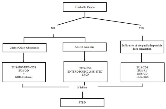 Endoscopic retrograde cholangiopancreatography (ERCP) is considered as the first option in the management of malignant biliary obstruction, with rates of successful deep cannulation ranging from 89% to 92% using conventional techniques [,,]. Common causes of ERCP failure may include periampullary diverticulum or ampullary distortion due to malignant infiltration [], nevertheless advanced endoscopic techniques (i.e., double wire-guided technique, pre-cut, transpancreatic papillary septotomy) have shown to improve cannulation rates by up to 97% in such cases [,]. Sometimes the papilla remains non-accessible at all because of gastric outlet obstruction (GOO) or surgically altered gastrointestinal (GI) anatomy due to different (benign or malignant) conditions [,]. In case of ERCP failure, percutaneous transhepatic biliary drainage (PTBD) has been conventionally considered as the preferred rescue strategy because of its high success rate. However, the significant rate of adverse events (i.e., tube dislodgement/occlusion, cholangitis) significantly contribute to reducing the quality of life of our patients [,].