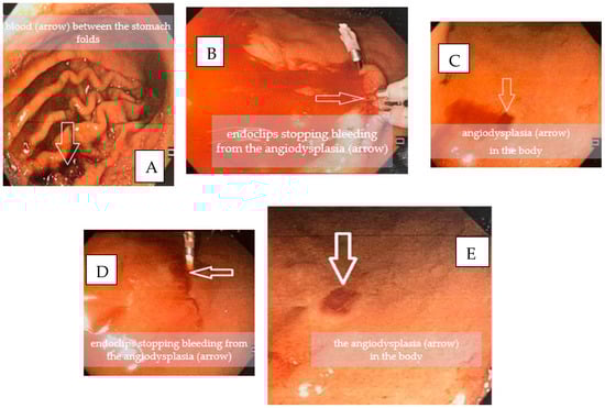 Gastroscopy images. (A)—blood between the folds of the stomach; (B,D)—endoclips; (C,E)—angiodysplasias of the body.