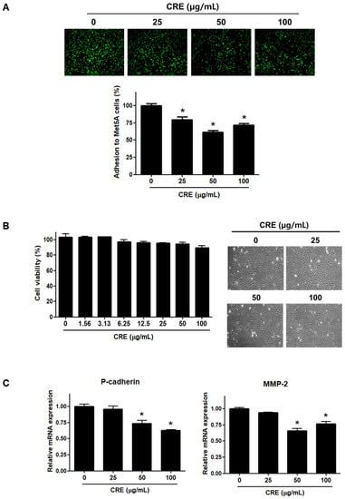 Since the implantation of endometrial fragments at the peritoneum, which is covered by a mesothelial cell layer, is a key step in the establishment of endometriosis [24,26], we investigated the effect of CRE on the adhesion of endometriotic cells to mesothelial cells. As shown in Figure 1A, pre-treatment of human endometriotic 12Z cells with CRE (25, 50, and 100 µg/mL) significantly reduced the adhesion of 12Z cells to human peritoneal mesothelial Met5A cells. The inhibitory effect of CRE on the adhesion of 12Z cells to Met5A cells was not attributed to cytotoxic effects when the endometriotic cells were exposed to CRE up to 100 µg/mL for 24 h (Figure 1B). Furthermore, we investigated the expression of P-cadherin and MMP-2, which have been well known as potent determinants in peritoneal adhesion formation [5], after treatment with CRE in endometriotic 12Z cells. The results of real-time RT-PCR showed that CRE at concentrations of 50 and 100 µg/mL significantly decreased the mRNA expression of P-cadherin and MMP-2 in 12Z cells (Figure 1C).