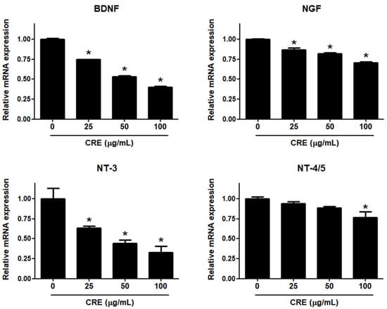 Effect of CRE on the expression of neurotrophins in endometriotic cells. The 12Z cells were treated with CRE (25, 50 and 100 µg/mL) for 24 h, and then the mRNA expression of neurotrophins (BDNF, NGF, NT-3 and NT-4/5) was measured by real-time RT-PCR. All expression levels were normalized to GAPDH. Results are the combined data (mean ± S.D.) from three independent experiments. * p < 0.05 compared with control group.