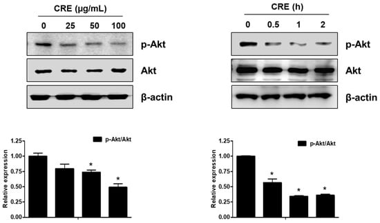 Effect of CRE on the phosphorylation of Akt in endometriotic cells. 12Z cells were treated with CRE (25, 50 and 100 µg/mL) for 2 h or with CRE (100 µg/mL) for 0.5, 1 and 2 h. Phosphorylated Akt and total Akt were measured by western blot analysis using specific antibodies. β-Actin was used as an internal control. Data are shown as mean band density. Data are presented as the means ± SD of three independent experiments; * p < 0.05 as compared with the control group.