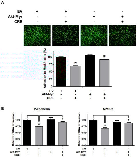 Involvement of the Akt pathway in endometriotic cell adhesion to mesothelial cells and expression of adhesion molecules in endometriotic cells. 12Z cells were transfected with an empty vector (EV) or a constitutive active form (Akt-Myr), and then the cells were treated with CRE (100 µg/mL). After 24 h, (A) an adhesion assay and (B) a real-time RT-PCR were performed. The mRNA expression of P-cadherin and MMP-2 was normalized to GAPDH. * p < 0.05 compared with EV-transfected none treatment group and # p < 0.05 compared with EV-transfected CRE treatment group.