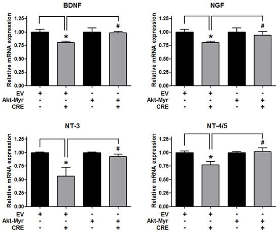 Involvement of the Akt pathway in the expression of neurotrophins in endometriotic cells. The 12Z cells were transfected with an empty vector (EV) or a constitutive active form (Akt-Myr), and then the cells were treated with CRE (100 µg/mL). After 24 h, real-time RT-PCR was performed to measure the mRNA expression of BDNF, NGF, NT-3 and NT-4/5. The expression levels were normalized to GAPDH. * p < 0.05 compared with EV-transfected none treatment group and # p < 0.05 compared with EV-transfected CRE treatment group.