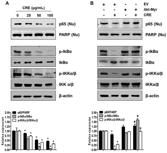 Effect of CRE on the NF-kB activation in endometriotic cells. Nuclear (Nu) and whole cellular proteins were isolated from the cells (A) treated with CRE (25, 50 and 100 µg/mL) for 8 h and (B) transfected with EV or Akt-Myr. The levels of p65 (Nu), p-IkBα, IkBα, p-IKKα/β and IKKα/β were detected by western blot analysis using specific antibodies. PARP and β-actin were used as an internal control for nuclear fractions and whole cell lysates, respectively. Data are shown as mean band density. Data are presented as the means ± SD of three independent experiments; * p < 0.05 as compared with the control group, and # p < 0.05 as compared with EV-transfected CRE treatment group.